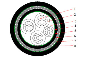 1. Conducteur: Cuivre ou aluminium, Classe 1: conducteur solide, ou Classe 2: conducteur toronné 2. Isolation: Chlorure de Polyvinyle PVC 3. Remplissage: Matériau non hygroscopique 4. Armure du conducteur: Matériau non hygroscopique 5. Gaine interne: Chlorure de Polyvinyle PVC 6. Armure: Fil d’acier à faible taux de carbone 7. Armure du conducteur: Matériau non hygroscopique 8. Gaine externe: Chlorure de Polyvinyle PVC |